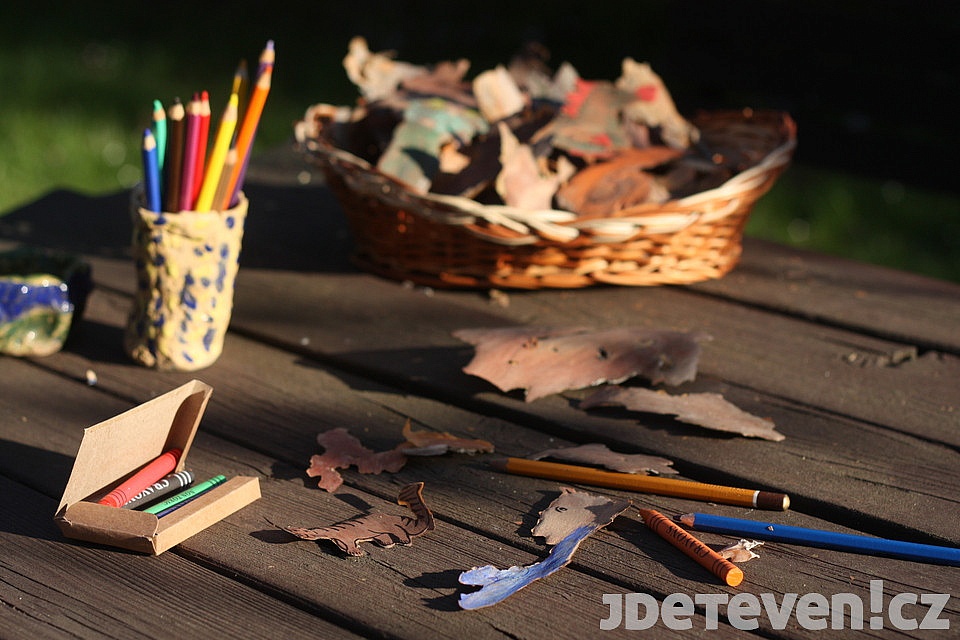 Pro kreslení na kůru se nejlépe osvědčily akvarelové pastelky nebo voskovky a měkká tužka. Pro zvýraznění detailů lze použít i tenký černý fix.