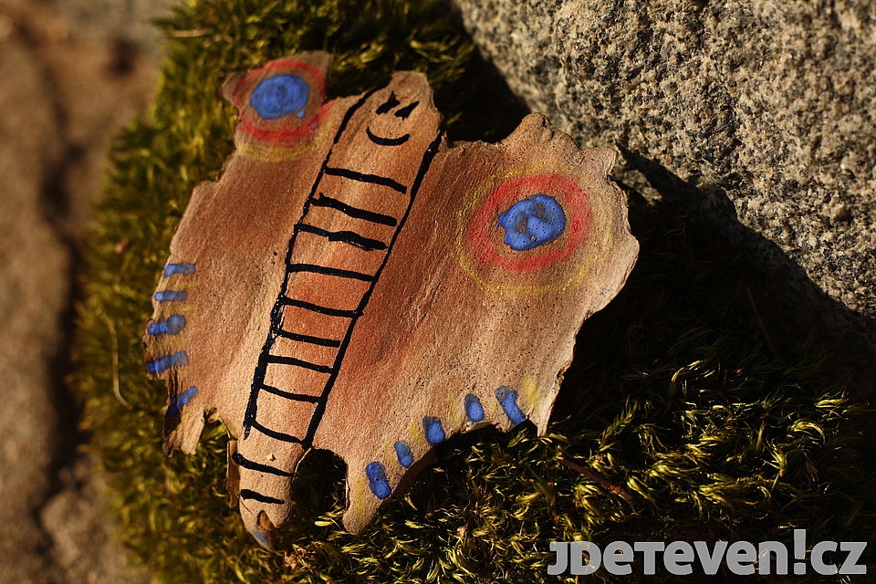 Zdobení kůry je nenáročné a můžeme se do něj pustit přímo na místě. Nebo si samozřejmě lze sesbíranou kůru donést domů. Aby tvary vynikly, je dobré z okrajů kůry opatrně otrhat tenkou průsvitnou slupku. Můžeme ji ale také nechat třeba tam, kde budou oči nebo okýnka. Proti slunci totiž krásně vynikne.